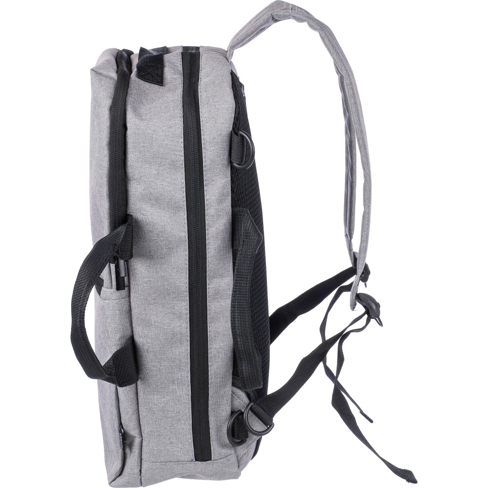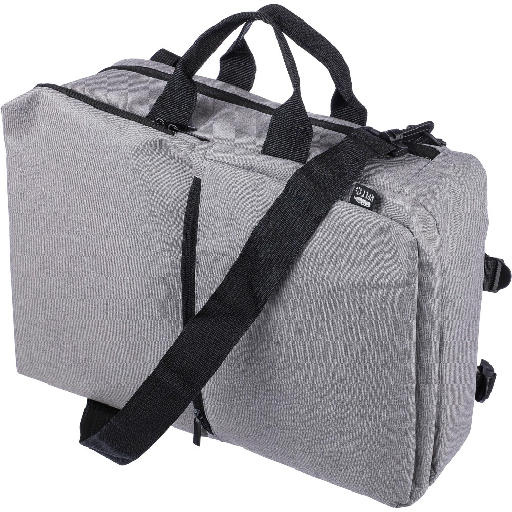 Hátizsák és laptoptáska 15 -es készülékhez. Kézipoggyász méretű. Hordozófüllel a tetején, állítható vállpántokkal és két oldalsó fogantyúval. Az állítható pántok a párnázás mögé rejthetők, így az oldalsó fogantyúkkal is hordozható. Tépőzáras laptoprekesszel és kis cipzáras zsebbel rendelkezik. Szellőző, párnázott hátoldallal. Terhelhetősége kb. 8 kg. RPET alapanyagra utaló címkével. Anyaga: 300D RPET poliészter.