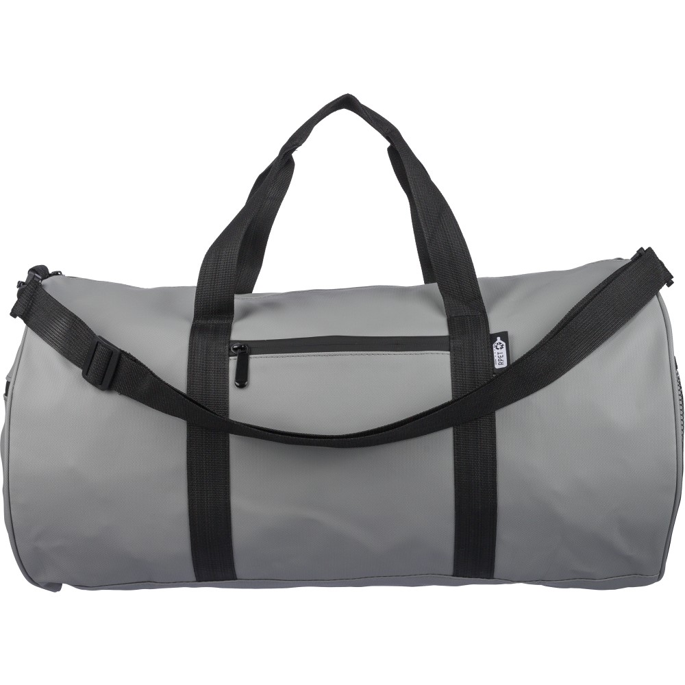 600D poliészterből készült rPET sporttáska 210D béléssel és vízlepergető PU bevonattal, 40 literes űrtartalommal. Elülső és oldalsó cipzáras zsebbel, hálós oldalzsebbel, két fogantyúval és állítható vállpánttal rendelkezik. Külső felületén rPET címkével ellátva.