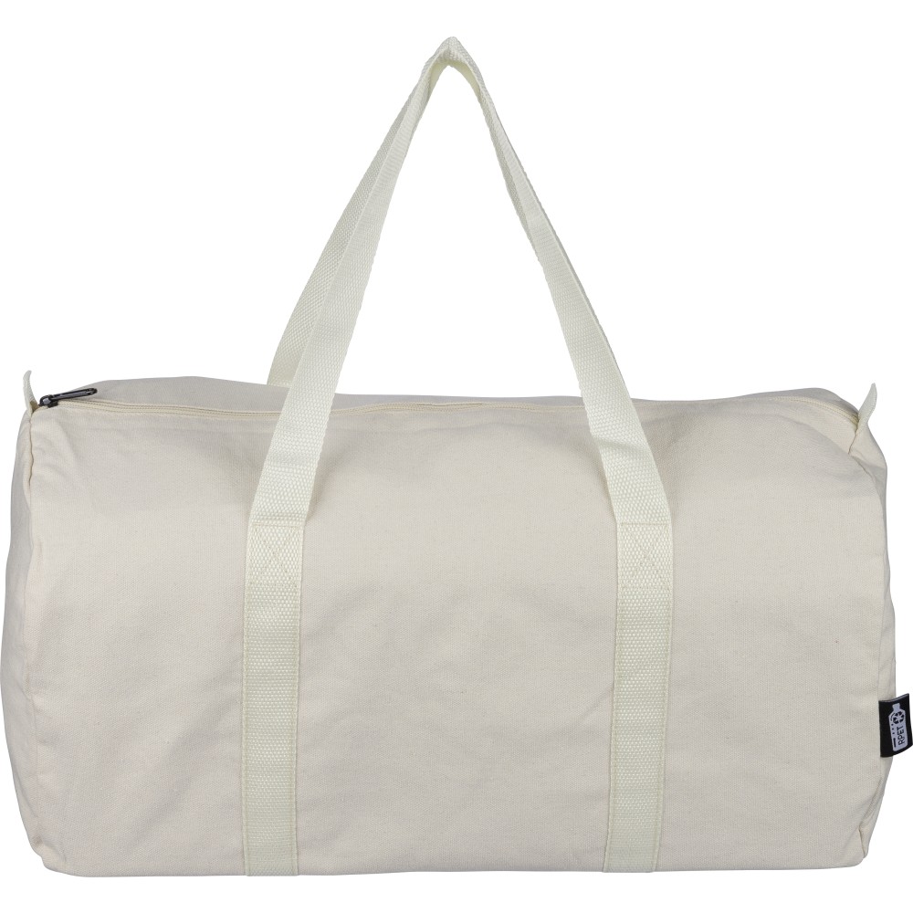Újrahasznosított pamut-poliészter, 330 g/m2 kevertszövetből készült sporttáska nagy, cipzáras felső rekesszel, 100 cm hosszúságú és 3 cm szélességű hosszú fülekkel, a táska színével megegyező hevederrel. Megközelítőleg 30 literes űrtartalommal rendelkezik. A külső felületen rPET címkével, a belső részben újrahasznosított alapanyagra utaló címkével ellátva.